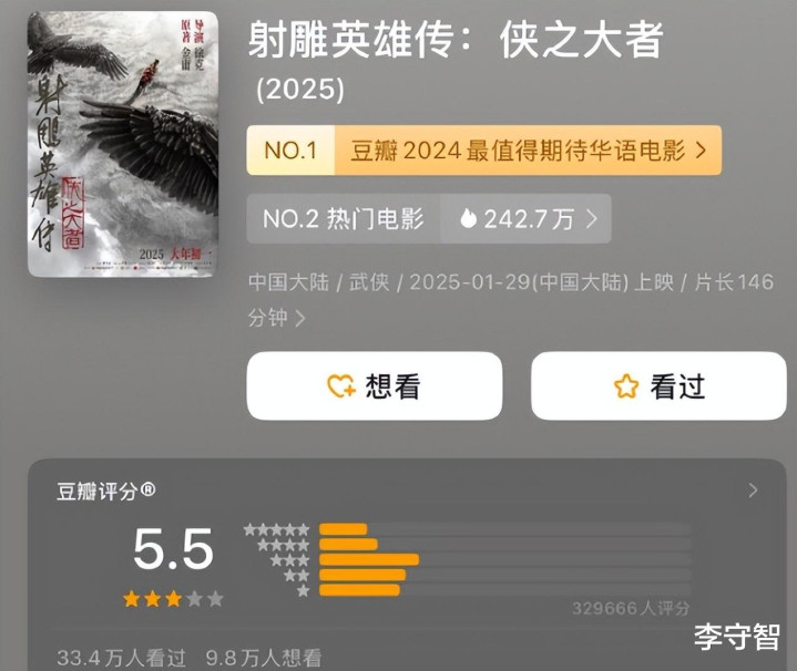 而肖战的《射雕英雄传:侠之大者》堪称本年度春节档最“热”的电影,虽然最终的票房和口碑不如预售第一那么风光,但关注以及争议最高,只是没有转化成票房。而且相比其他几部电影开分较早,肖战的《射雕》几乎拖到最后才开分,不知道是之前打分的太少,还是害怕遭遇恶意低分影响口碑和票房。最终5.5的评分,也算和争议最大的电影算是匹配。但是这个垫底的评分,票房却也不算很差。而不少粉丝认为,这个评分,遭遇了一些恶意打低分,从一些数据能看出端倪,甚至有人曝光了有网友没看电影就打分还是打低分,有点欺负人。就算肖战的射雕口碑不算最好,争议也多,但拿个及格分数应该还是可以,毕竟其余几部的状态都差不多,也拿了及格分数,5.5的评分确实不好看。