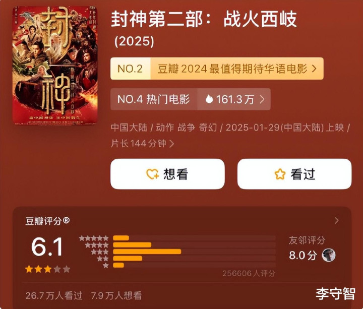 同样是被寄予厚望的《封神2》这次成绩也不理想,看着春节档蛋糕大,却分不了多少,票房排行第三,评分才6.1,勉强及格。不过这样的分数,也说明了为什么票房上不去。