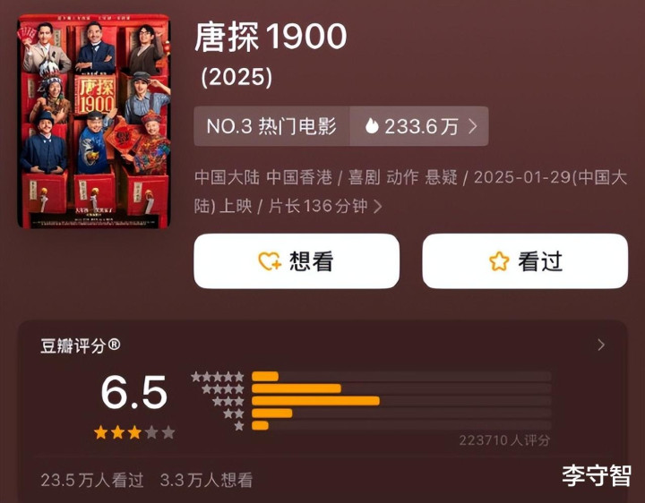 票房一直排名第二的《唐探1900》,虽然是陈思诚唐探系列第四部,有一定的热度和票房积累,但口碑其实也不算好,6.5的网络评分,不算好口碑,褒贬不一中,吐槽多过夸赞。